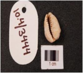 | Description / विवरण | Cowrie shell with natural grooved line and powdery surface. |