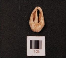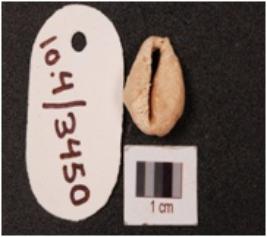 | Description / विवरण | Cowrie shell with a natural groove and powdery surface, partly damaged. |