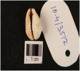 | Description / विवरण | Cowrie, natural marine shell, bulbous top and powdery surface. |
