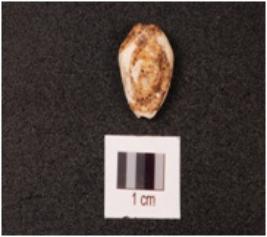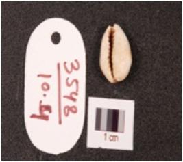 | Description / विवरण | Cowrie shell with grooved lines, powdery surface and white colour. |