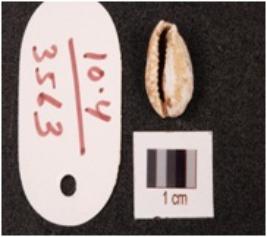 | Description / विवरण | Cowrie shell natural marine object with powdery surface. |