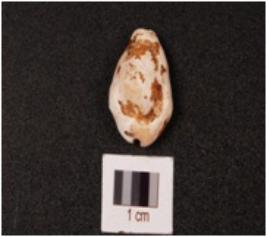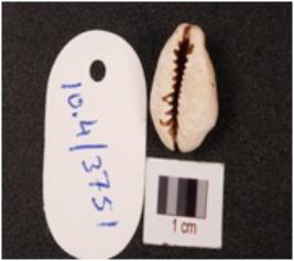 | Description / विवरण | A cowrie shell with powdery surface, natural groove at the base and off white in colour. |