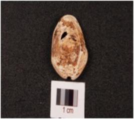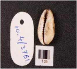 | Description / विवरण | A cowrie shell with bulbous and partly damaged top, natural groove at the base and off white in colour |