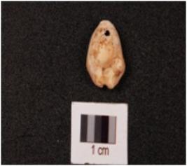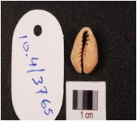 | Description / विवरण | A cowrie shell with bulbous and partly damaged top, natural groove at the base, and off white in colour. |