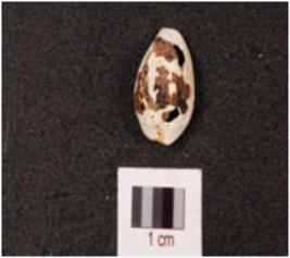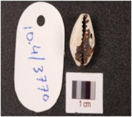 | Description / विवरण | A cowrie shell with partly damaged surface, natural groove at the base and off white in colour. |