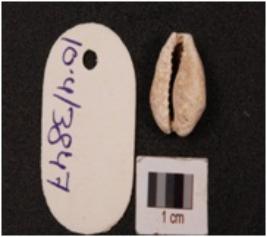 | Description / विवरण | Cowrie shell with bulbous top, powdery surface, natural groove at the base and off white colour. |