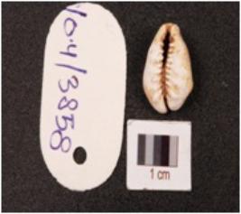 | Description / विवरण | Cowrie shell with bulbous top, powdery surface, natural groove at the base and cream colour. |
