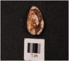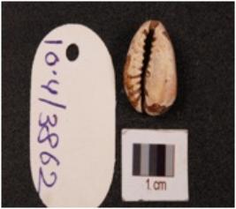 | Description / विवरण | Cowrie shell with bulbous top, powdery surface, natural groove at the base and cream colour. |