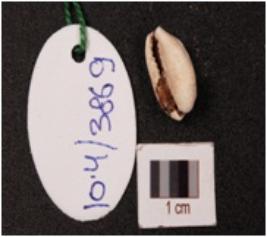 | Description / विवरण | Cowrie shell with bulbous top, powdery surface, natural, groove at the base and cream colour. |
