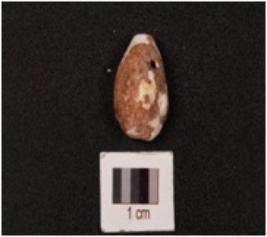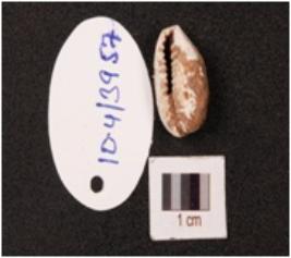 | Description / विवरण | A cowrie shell, a natural marine object with groove on surface, powdery surface, natural white in colour and damage on interior surface. |