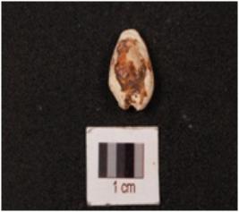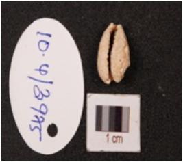| Description / विवरण | A cowrie shell, natural marine object with groove on surface, powdery surface and white in colour. |