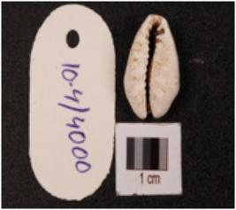 | Description / विवरण | A cowrie shell, natural marine object with natural groove, powdery surface and damage on the exterior surface. |