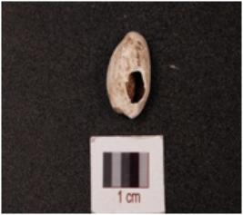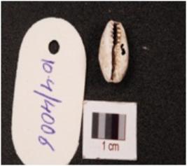 | Description / विवरण | A cowrie shell, natural marine object with natural groove, black pigments on surface and damage on exterior. |