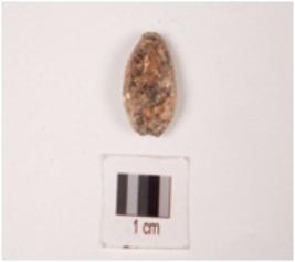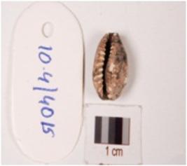 | Description / विवरण | A cowrie shell, natural marine object with natural groove, black pigmentation on surface. |