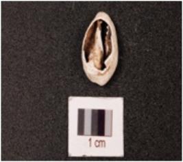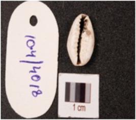 | Description / विवरण | A cowrie shell, natural groove and damage on the exterior. |