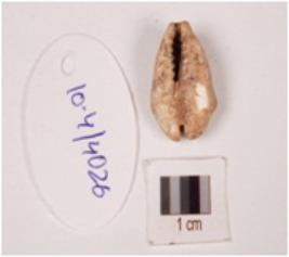 | Description / विवरण | A cowrie shell, natural marine object with natural groove. |