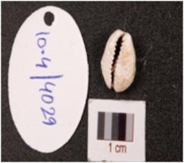 | Description / विवरण | A cowrie shell, natural marine object with natural groove, powdery surface. |