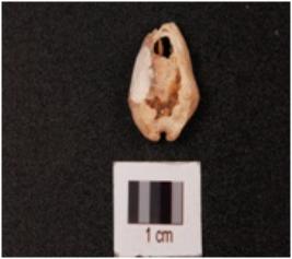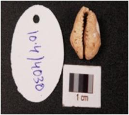 | Description / विवरण | A cowrie shell, natural marine object with natural groove and damage on the exterior surface. |