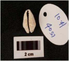 | Description / विवरण | A cowrie shell, natural marine object, natural white colour, powdered surface and uneven exterior surface. |