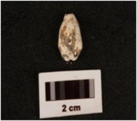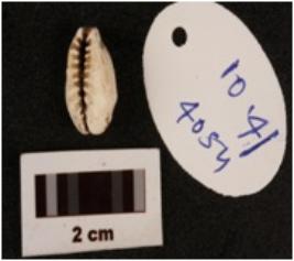 | Description / विवरण | A cowrie shell, natural marine object, natural white colour, powdery surface, little blackening on exterior surface. |
