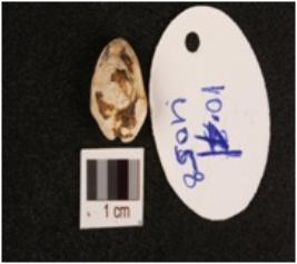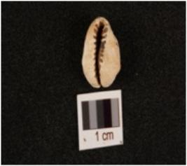 | Description / विवरण | A cowrie shell, natural marine object, natural white colour, powdered uneven surface and blacking on surface. |