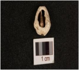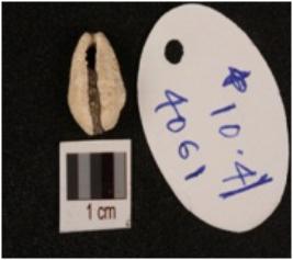 | Description / विवरण | A cowrie shell, natural marine object powdered surface and broken exterior surface. |