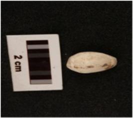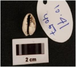 | Description / विवरण | A cowrie shell, natural marine object, natural white colour, powdery surface, round and smooth exterior. |