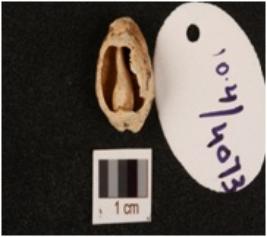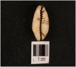 | Description / विवरण | A cowrie shell, a natural marine object with natural groove and powdery surface. |