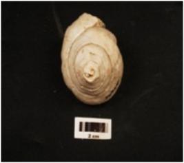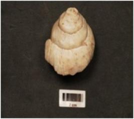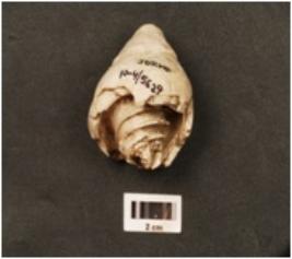 | Description / विवरण | Mouth piece of shell conch with spiral design on top and smooth surface. |