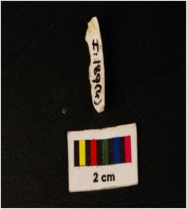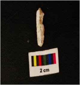 | Description / विवरण | A microlithic point with a mid ridge on dorsal broken at distal end, diffused bulb on ventral side, triangular in section and partly cortex visible on left dorsal side. |