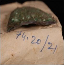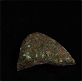 | Description / विवरण | Fragment of copper vase. Thin in section. Round headed rim and corroded surface . |