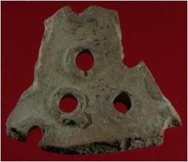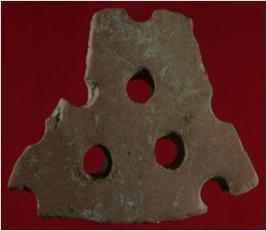 | Description / विवरण | Trench A- 2, Qd 2, Layer 6 This is a perforation sherd made of terracotta. It has three hole in it. Surface is rough and appearance is brick brown. |