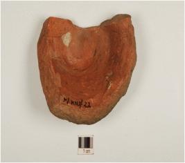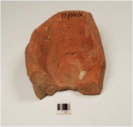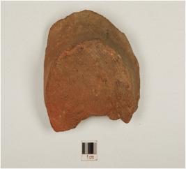 | Description / विवरण | A base fragment of pot of red ware, flat base of medium fabric, showing an oxidized core and treated with red slip. |