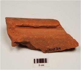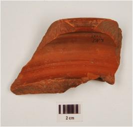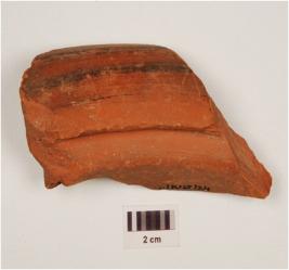 | Description / विवरण | Fragment of rim jar of red ware, treated with red slip on both sides, has horizontally splayed out rim, depression inside, concave neck, painted with three horizontal bands on the top of the rim in black pigment. |