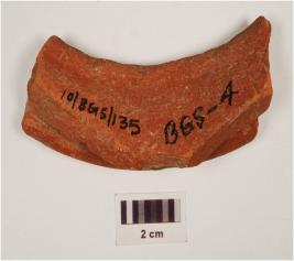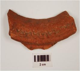 | Description / विवरण | A rim fragment of a vessel of red ware treated with red slip, has recurved rim decorated with triangular notches at the top. |