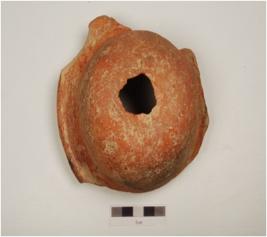 | Description / विवरण | A red ware vase, featureless rim slightly broken, concave neck, slightly broken ledge on shoulder, goblular profile, traces of red slip and medium fabric. |
