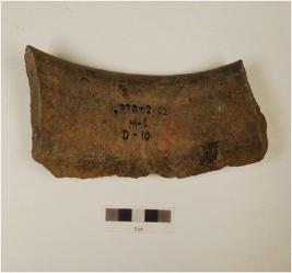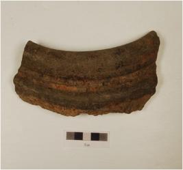 | Description / विवरण | A fragment of storage jar of dull red ware, with externally thickened rim, groove outside below ridge of medium fabric, showing an oxidized core and treated with grey slip. |