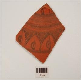 | Description / विवरण | Fragment of a red ware treated with red slip on the outer surface painted with series of arches filled with alternate hatching and circlets with dots and vertical strokes bordered between horizontal bands. |