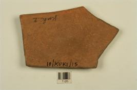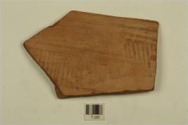| Description / विवरण | A fragment of a bowl of red ware,featureless rim,convex profile having faded horizontal lines with vertical lines in between in black pigment on the exterior,of medium fabric,showing an incomplete oxidized core and treated with buff slip. |
