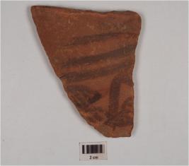| Description / विवरण | A fragment of red ware painted pottery, having floral pattern within horizontal line in black pigment on exterior surface, made of medium fabric and well baked. |