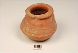 | Description / विवरण | A miniature handi of red ware, out turned flat rim, bulging at waist,foot base, treated with red slip, and well baked. |