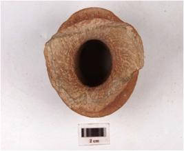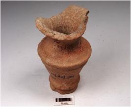 | Description / विवरण | Fragment of a vase of red ware having featureless rim, a circular projection on neck, and two circular projections on profile, spreading profile, partly broken, traces of red slip. |