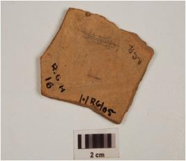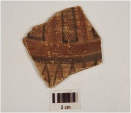 | Description / विवरण | A fragment of dull red ware, treated with buff slip, painted with vertical line and three strokes, suspended triangles with horizontal band in black pigment on the exterior. |
