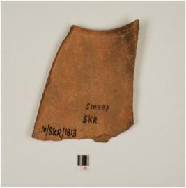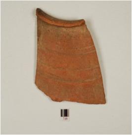 | Description / विवरण | Fragment of vase of red ware treated with red slip on the exterior, and decorated with horizontal groove lines has obliquelly splayed out rim and globular profile. |