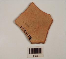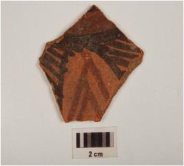 | Description / विवरण | A fragment of red ware vessel treated with buff slip on exterior, painted with oblique line and triangle on the exterior in black and brown pigment. |