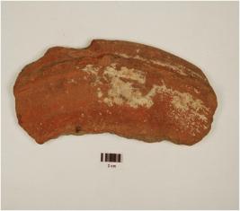 | Description / विवरण | A Fragment of rim, basin of red ware, with broken rim below ridge, of medium fabric, showing an incomplete oxidized core and treated with red slip on both side. |