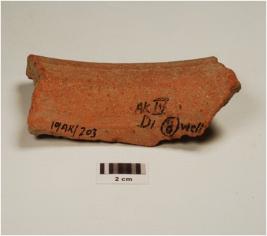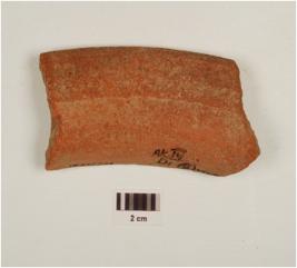 | Description / विवरण | A Fragment of rim, vase of red ware, with flaring rim, of medium fabric, showing an oxidized core and treated with red slip. |