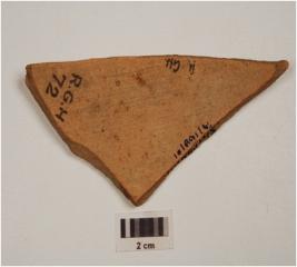 | Description / विवरण | Fragment of a dull red ware treated with buff slip on both sides with rustication on the outer surface. |