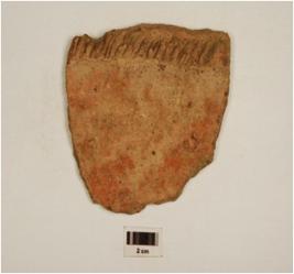 | Description / विवरण | A fragment of pot of dull red ware, decorated with applique design on the exterior of medium fabric, showing an oxidized core and treated with red slip. |