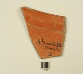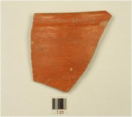 | Description / विवरण | Fragment of lustrous red ware, featureless rim with groove, convex profile, treated with orange slip and of fine fabric. |